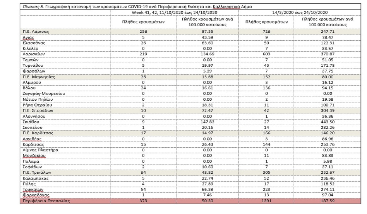 Τα στοιχεία που παρουσιάζονται αφορούν περιστατικά από την επιδημιολογική επιτήρηση της νόσου από το νέο κορωνοϊό (COVID- 19), με βάση τα δεδομένα που έχουν δηλωθεί και καταγραφεί από την ΚΟΜΥ του ΕΟΔΥ της 5ης Υ.Π.Ε. από την 14η Μαρτίου έως τις 17 Οκτωβρίου 2020. Η παρούσα έκθεση επιδημιολογικής επιτήρησης της λοίμωξης από το νέο κορωνοϊό (COVID-19) συντάσσεται σε συνεργασία του Εργαστηρίου Υγιεινής και Επιδημιολογίας της Ιατρικής Σχολής του Πανεπιστημίου Θεσσαλίας και του Συντονιστικού Κέντρου COVID-19 της Περιφέρειας Θεσσαλίας.