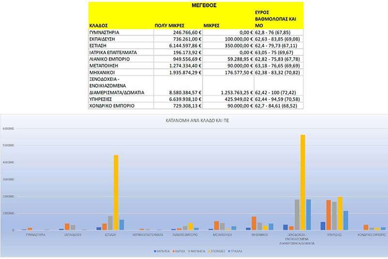 Η χρηματοδότηση από το συγκεκριμένο πρόγραμμα σε ποσοστό άνω του 90% αφορά πολύ μικρές επιχειρήσεις. Για παράδειγμα σε όλη τη Θεσσαλία τα γυμναστήρια παίρνουν 246.000 ευρώ, η εκπαίδευση 736.000 ευρώ, η εστίαση 6.144.000 ευρώ, το λιανικό εμπόριο 950.000 ευρώ, η μεταποίηση 1.274.000 ευρώ., τα τουριστικά καταλύματα και τα ξενοδοχεία 8.500.000, οι υπηρεσίες (λογιστές, υδραυλικοί, δικηγόροι, κλπ.) 6.639.000 ευρώ και το χονδρικό εμπόριο 721.000 ευρώ. εκείνοι που δικαιούνται από τους συγκεκριμένους κλάδους την ενίσχυση είναι εκείνοι που έχουν τη μεγαλύτερη ανάγκη.