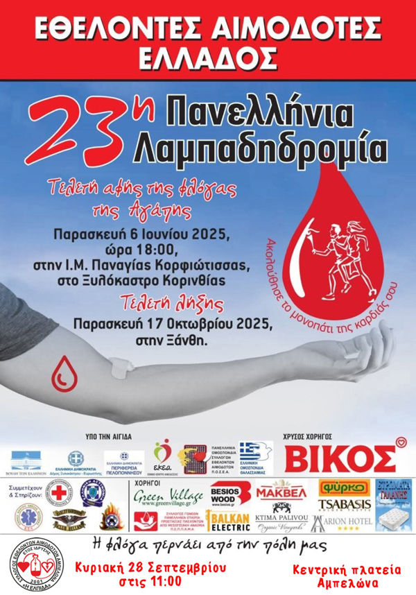 Τέλος, καλούνται οι μαθητές των σχολείων, οι πρόσκοποι και οι αθλητές των Συλλόγων και όποιος άλλος θέλει και μπορεί να γίνει Εθελοντής Λαμπαδηδρόμος, να περάσει νωρίτερα από την Κεντρική πλατεία, όπου θα πραγματοποιείται η 113η Αιμοδοσία μας να παραλάβει το ειδικό μπλουζάκι και τη δάδα της Λαμπαδηδρομίας για να πάρει μέρος στην 23η Πανελλήνια Λαμπαδηδρομία αιμοδοσίας και να μεταφέρει τη Φλόγα της Αγάπης, της Ελπίδας και της Ζωής από την είσοδο του Αμπελώνα μέχρι την Κεντρική πλατεία.