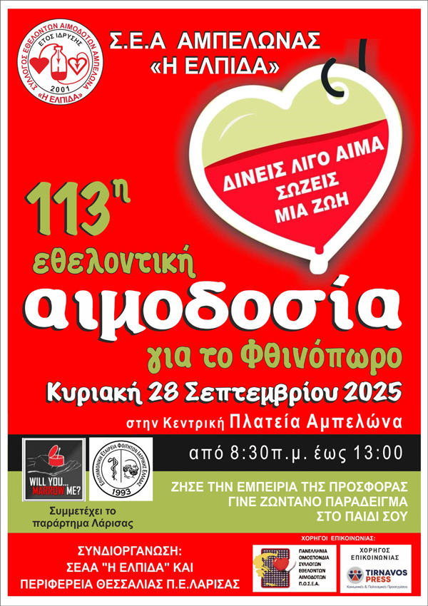Με την έναρξη του Φθινοπώρου ο Σύλλογος Εθελοντών Αιμοδοτών Αμπελώνα «Η ΕΛΠΙΔΑ», πραγματοποιεί σε συνεργασία με την Περιφέρεια Θεσσαλίας Π.Ε. ΛΑΡΙΣΑΣ και την υποστήριξη της ΠΟΣΕΑ την 113η Εθελοντική Αιμοδοσία του για το Φθινόπωρο την Κυριακή, 28 Σεπτεμβρίου 2025, από τις 8.30 το πρωί ως τις 13:00 στην Κεντρική πλατεία του Αμπελώνα.