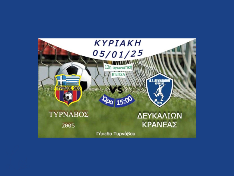 Ο Τύρναβος 2005 υποδέχεται την ομάδα του Π.Α.Ο. Δευκαλίων Κρανέας στις 15:00, στο πλαίσιο της 12ης αγωνιστικής του 1ου ομίλου της Β’ ΕΠΣΛ.