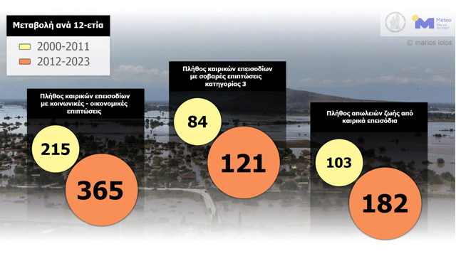 Την 1η 12-ετία καταγράφηκαν 84 σοβαρά επεισόδια (7 κατά μέσο όρο ετησίως) και την 2η 12-ετία καταγράφηκαν 121 σοβαρά επεισόδια (~10 κατά μέσο όρο ετησίως). Επομένως, το 2ο μισό της περιόδου 2000-2023 είχαμε 44% αύξηση στα καιρικά επεισόδια με σοβαρές επιπτώσεις (κατηγορίας 3) σε σχέση με το 1ο μισό της περιόδου.
