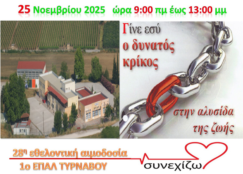 Την Τρίτη, 25 Νοεμβρίου 2025, θα πραγματοποιηθεί στο 1ο ΕΠΑΛ Τυρνάβου, σε συνεργασία με το τμήμα αιμοδοσίας του Γενικού Νοσοκομείου Λάρισας, η 28η συνολική εθελοντική αιμοδοσία.