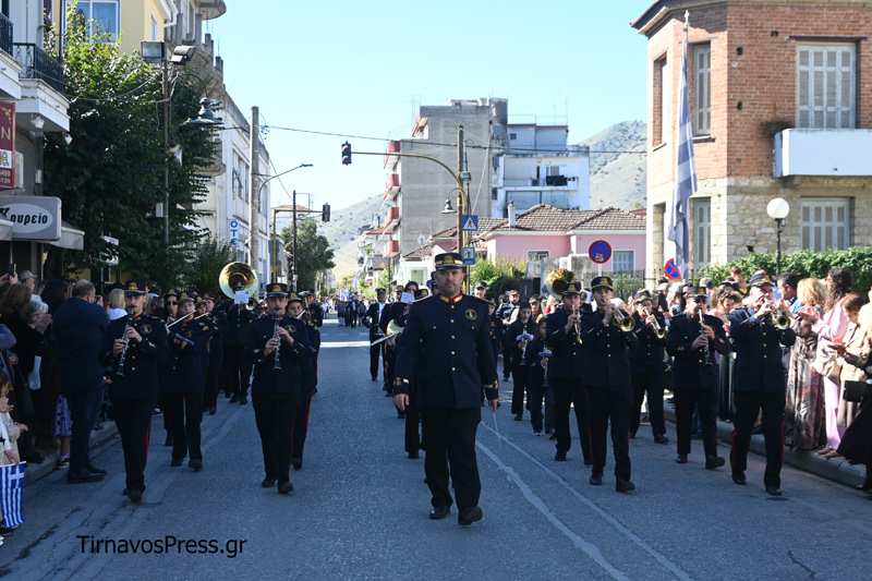 Η Φιλαρμονική του Δήμου Τυρνάβου, υπό τη διεύθυνση του μαέστρου Θέμη Σαμαντζή, έδωσε το έναυσμα της παρέλασης, σκορπίζοντας πατριωτικούς ήχους και ρυθμό.