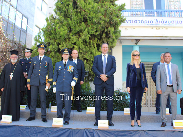 Στην εξέδρα των επισήμων, ο Δήμαρχος Τυρνάβου κ. Ιωάννης Κόκουρας, Εκπρόσωπος της Περιφέρειας Λάρισας Τάνια Δόκου, ο εκπρόσωπος του Αστυνομικού Τμήματος Τυρνάβου, ο Αντιδήμαρχος κ. Γεώργιος Σακούτσιος, οι εκπρόσωποι της εκπαίδευσης, ο Αρχιερατικός Επίτροπος πάτερ Γεώργιος και εκπρόσωπος των εφέδρων αξιωματικών του ΣΕΑΝ Λάρισας.