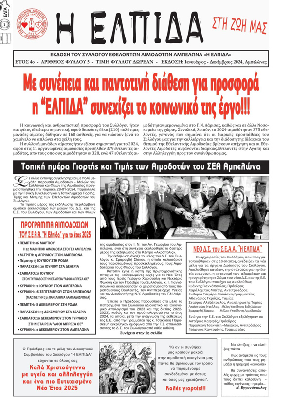 Ετήσια έκδοση του Συλλόγου Εθελοντών Αιμοδοτών Αμπελώνα «Η ΕΛΠΙΔΑ» για το διάστημα Ιανουάριος- Δεκέμβριος 2024.