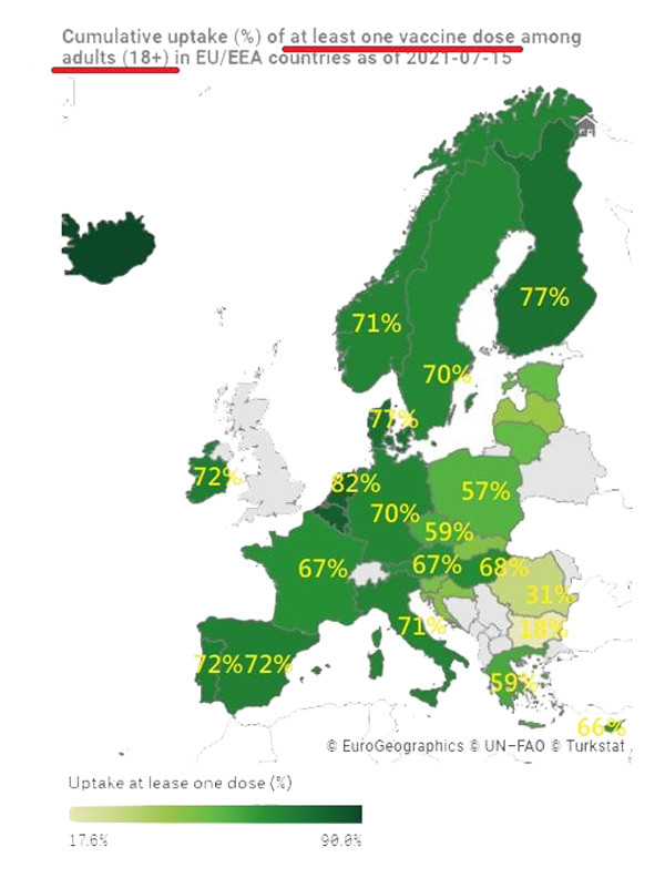 Ορόσημο η σημερινή ημέρα αφού το ποσοστό όσων έχουν εμβολιαστεί με την Α΄ δόση, έφτασε στο 50% των κατοίκων της χώρας μας (10,8 εκατομμύρια κάτοικοι). Αν μάλιστα υπολογίσουμε τα 5,37 εκατομμύρια ως ποσοστό των ενηλίκων οι οποίοι έχουν δικαίωμα εμβολισμού, τότε το ποσοστό όσων έχουν εμβολιστεί με μία έστω δόση, ανεβαίνει στο 60%.