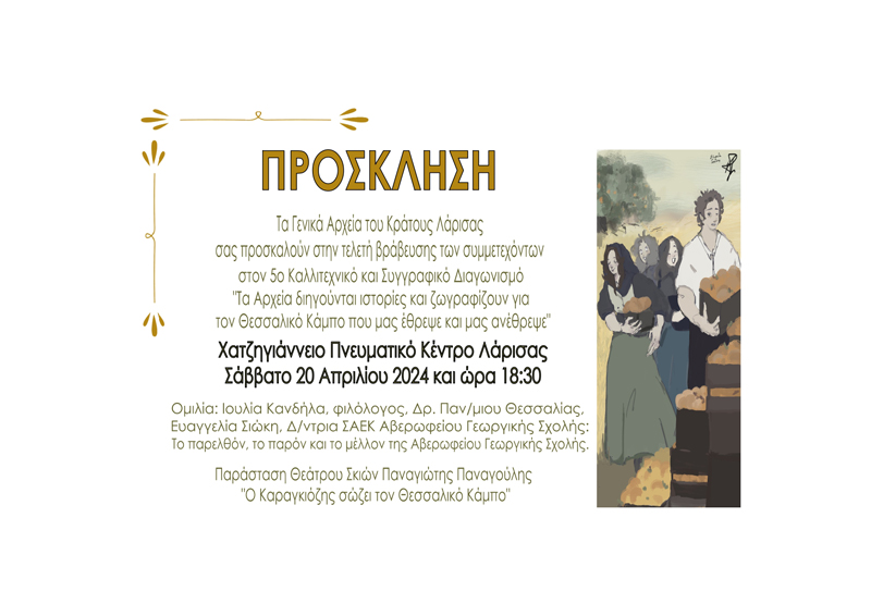 Τα ΓΑΚ Λάρισας σας καλούν στην τελετή λήξης και βράβευσης του 5ου μαθητικού  καλλιτεχνικού και συγγραφικού διαγωνισμού. Τιμήσαμε φέτος τον θεσσαλικό κάμπο, την καθημερινότητα και τα απρόβλεπτα, και οι μαθητές αναμετρήθηκαν με αρχειακά τεκμήρια, τις μνήμες και εμπειρίες τους και προσέγγισαν την τοπική ιστορία.