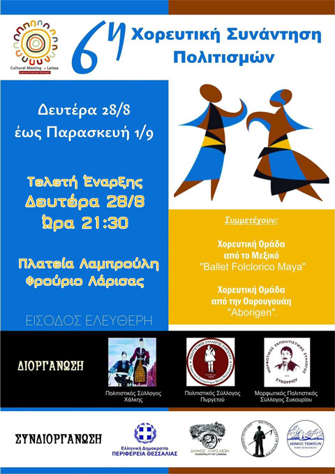 Η 6η Χορευτική Συνάντηση Πολιτισμών φιλοξενείται από την ερχόμενη Δευτέρα 28 Αυγούστου και μέχρι την Πέμπτη 31 Αυγούστου σε Λάρισα, Πυργετό, Συκούριο και Χάλκη, με τη συμμετοχή Χορευτικών Ομάδων από την Ουρουγουάη και το Μεξικό. Την εκδήλωση διοργανώνουν οι Πολιτιστικοί Σύλλογοι Χάλκης, Πυργετού και Συκουρίου με συνδιοργανώτρια την Περιφέρεια Θεσσαλίας και του Δήμους Λαρισαίων, Κιλελέρ και Τεμπών.