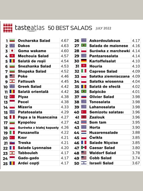 World’s #salads ranking according to TasteAtlas audience ratings, last update. Opinions? pic.twitter.com/WLvcGomSTO— TasteAtlas (@TasteAtlas) July 12, 2022