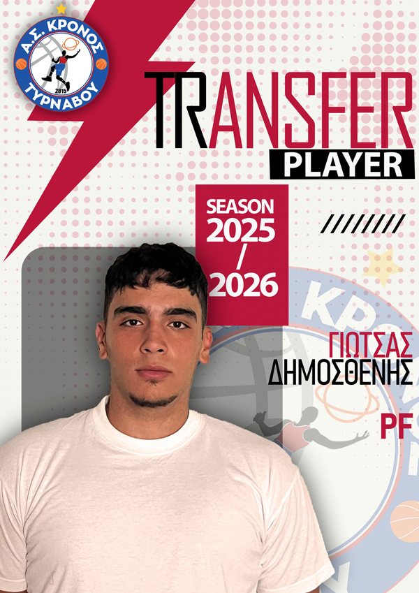 Ο Α.Σ. Κρόνος Τυρνάβου προχώρησε σε μια σημαντική ενίσχυση ενόψει της νέας αγωνιστικής περιόδου, ανακοινώνοντας την απόκτηση, με τη μορφή δανεισμού, του αθλητή Γιώτσα Δημοσθένη από τον Γ.Σ. Ελασσόνας.