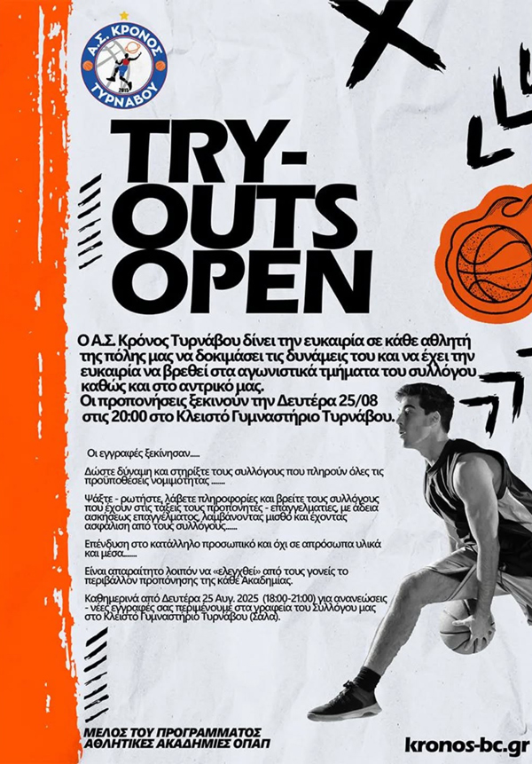 Οι προπονήσεις στον Α.Σ. Κρόνος Τυρνάβου ξεκινούν την Δευτέρα 25/08 στις 20:00 στο Κλειστό Γυμναστήριο Τυρνάβου