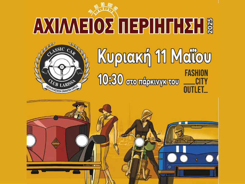 Η Λέσχη Κλασσικών Οχημάτων Λάρισας (Classic Car Club Larissa), στα πλαίσια του εορτασμού της πόλης και του Πολιούχου μας, διοργανώνει την Κυριακή 11 Μαΐου, την ’ ΑΧΙΛΛΕΙΟ ΠΕΡΙΗΓΗΣΗ 2025.’