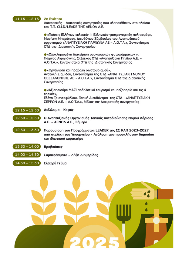Κατά τη διάρκεια του διημέρου θα παρουσιαστεί η πορεία και η συμβολή της ΑΕΝΟΛ Α.Ε. στην ενίσχυση της τοπικής επιχειρηματικότητας, της καινοτομίας και της αγροτικής ανάπτυξης, θα αναδειχθούν έργα και καλές πρακτικές που έχουν αλλάξει την εικόνα της υπαίθρου του Νομού Λάρισας και θα βραβευθούν επενδυτές και φορείς που βοήθησαν στην ανάπτυξη της περιοχής.