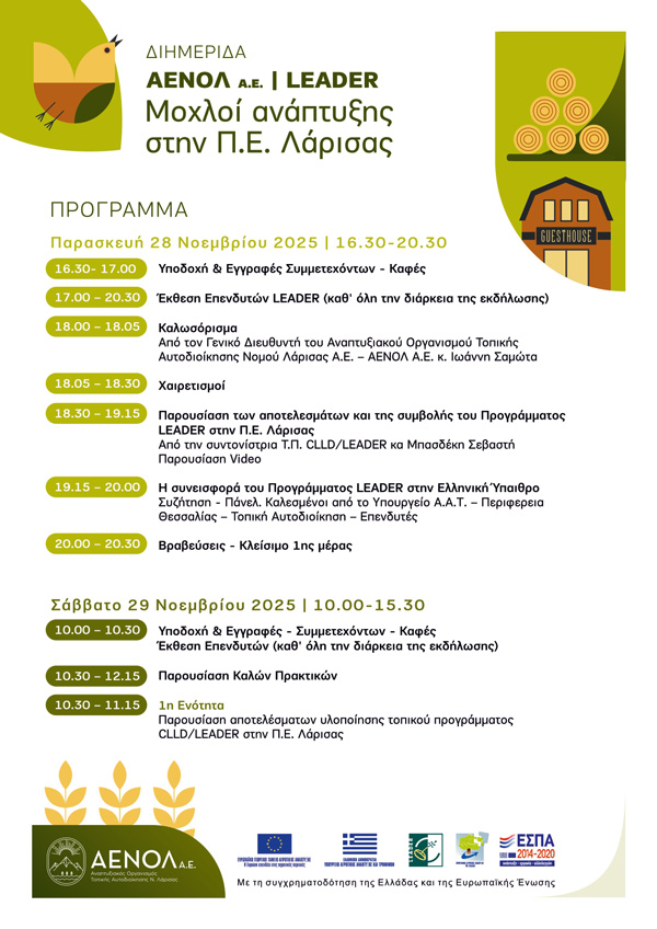 Ο Αναπτυξιακός Οργανισμός Τοπικής Αυτοδιοίκησης Νομού Λάρισας Α.Ε. – ΑΕΝΟΛ Α.Ε., με αφορμή την ολοκλήρωση του προγράμματος CLLD/LEADER του Προγράμματος «Αγροτική Ανάπτυξη της Ελλάδας 2014-2020» (ΠΑΑ), διοργανώνει επετειακή εκδήλωση με τίτλο «ΑΕΝΟΛ και LEADER: Μοχλοί Ανάπτυξης στην Π.Ε. Λάρισας», στο πλαίσιο εμψύχωσης του τοπικού πληθυσμού και των ενεργειών προβολής του τοπικού προγράμματος CLLD/LEADER και την παρουσίαση των αποτελεσμάτων του.
