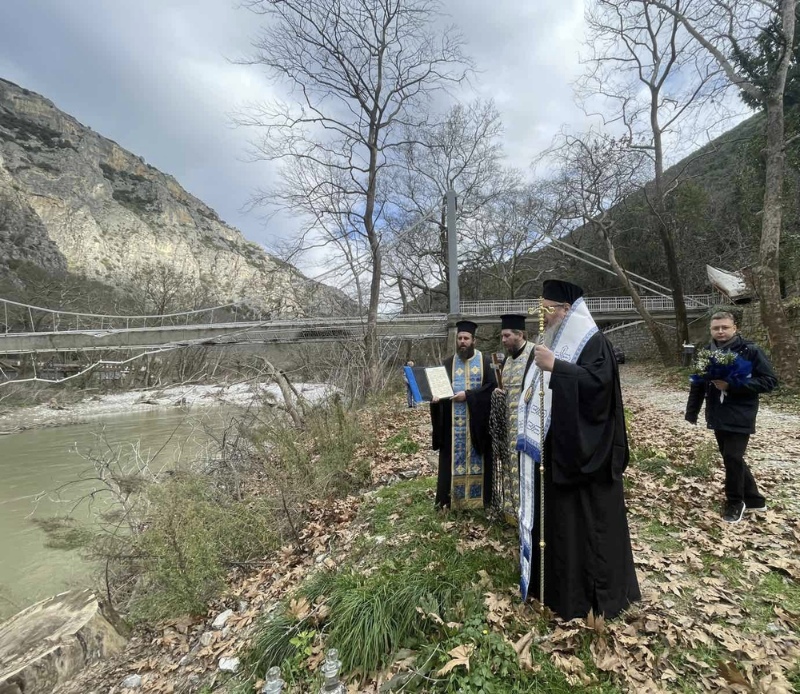 Παραμονή της Μεγάλης Δεσποτικής εορτής των Θεοφανείων, ο Σεβασμιώτατος Μητροπολίτης Λαρίσης και Τυρνάβου κ. Ιερώνυμος μετέβη στο κατεστραμμένο Ιερό Προσκύνημα της Αγίας Παρασκευής Τεμπών, στην απέναντι όχθη, προκειμένου να τελέσει την Ακολουθία της ρίψεως του Σταύρου στα ύδατα του ποταμού Πηνειού.