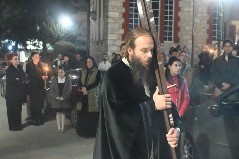 Πλήθος κόσμου παρακολούθησε απόψε στον Ιερό Ναό Αγίου Γεωργίου Τυρνάβου την κατανυκτική Ακολουθία της Σταύρωσης, παρουσία της Αντιπεριφερειάρχη Λάρισας κας Μαρίας Γαλλιού, του Δημάρχου Τυρνάβου κ. Στέλιου Τσικριτσή και του Προέδρου του Εμπορικού Συλλόγου Τυρνάβου Κώστα Πετμεζά.