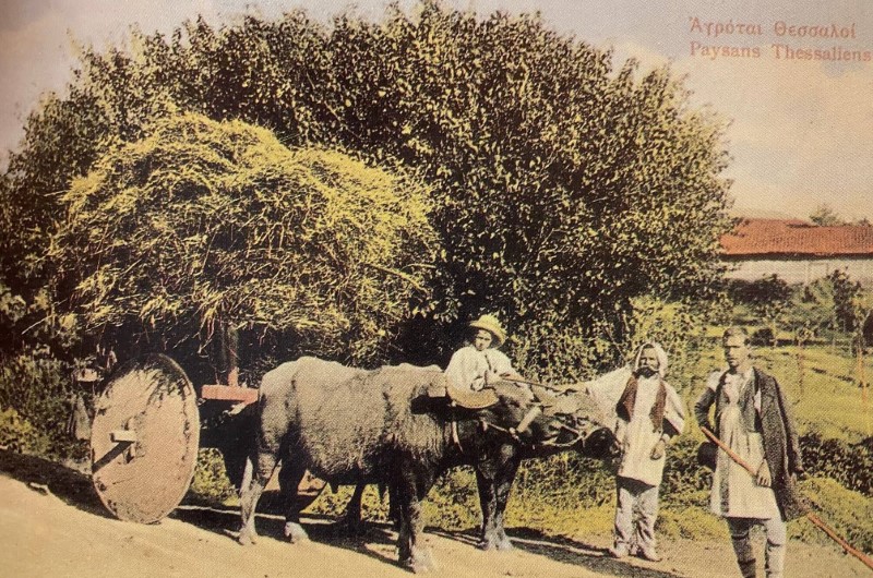 Αγρότες της περιοχής στις αρχές του αιώνα με τσαρούχια στα πόδια από δέρμα γουρουνιού και το χαρακτηριστικό τους κάρο. Οι συνθήκες εργασίας στην ύπαιθρο, στις αρχές του 20ου αιώνα παραμένουν ίδιες με αυτές που παρατήρησαν οι ξένοι περιηγητές στα γραπτά τους. Η φωτογραφία είναι χρωματισμένη εκ των υστέρων και έχει κυκλοφορήσει σε καρτ ποστάλ στις αρχές του αιώνα από την Ελληνική Ταχυδρομική Υπηρεσία.