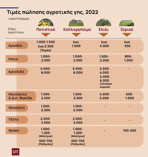 Στη Μεσσηνία και στη Λακωνία πωλούνται έως και 10.000 ευρώ/στρέμμα τα αγροτεμάχια με ελιές, ενώ στην Αργολίδα οι τιμές στα χωράφια με ελιές διαμορφώνονται από 2.500 έως και 6.000 ευρώ το στρέμμα.