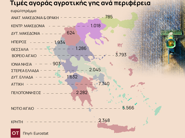 Παράλληλα, τα στοιχεία της Eurostat καταγράφουν τεράστια διακύμανση στις τιμές αγοράς αγροτικής γης σε ολόκληρη την ΕΕ τόσο από χώρα σε χώρα όσο και από περιφέρεια σε περιφέρεια.