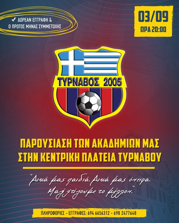 Ένα νέο κεφάλαιο για τον αθλητισμό στον Τύρναβο ανοίγει με τη επιστροφή της Ακαδημίας Τυρνάβου 2005, η οποία θα παρουσιαστεί επίσημα στο κοινό την Τετάρτη 3 Σεπτεμβρίου, στις 8 το βράδυ, στην κεντρική πλατεία Τυρνάβου.