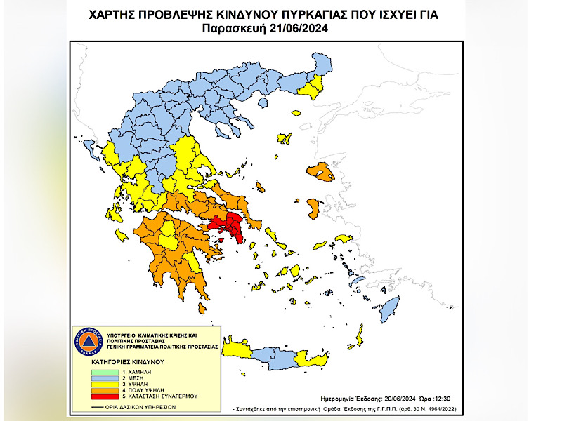 Σύμφωνα με το Χάρτη Πρόβλεψης Κινδύνου Πυρκαγιάς που εκδίδει η Γενική Γραμματεία Πολιτικής Προστασίας του Υπουργείου Κλιματικής Κρίσης & Πολιτικής Προστασίας (civilprotection.gov.gr), για αύριο Παρασκευή 21 Ιουνίου 2024, προβλέπεται: