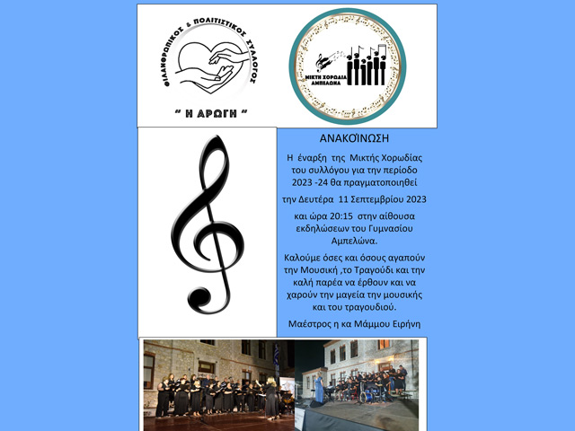 Οι ακροάσεις των νέων μελών για τη Μικτή Χορωδία ξεκινούν την Δευτέρα 11 Σεπτεμβρίου 2023 στις 20:15 στην αίθουσα εκδηλώσεων του Γυμνασίου Αμπελώνα.