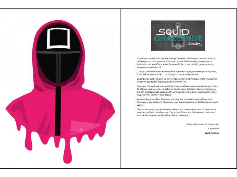 Μέσα από τη σελίδα, μάλιστα, οι διοργανωτές φέρονται να ζητούσαν 25 ευρώ ανά άτομο, για το Squid Game Challenge, που θα διοργανωνόταν στις 23 Οκτωβρίου σε άγνωστη τοποθεσία.