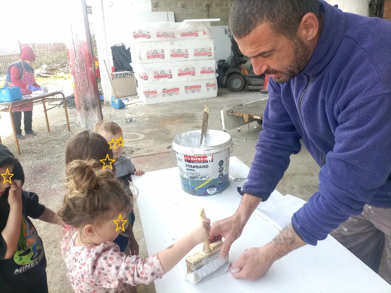 Ο καλλιτέχνης και πρωτεργάτης κύριος Τέλης Μπλάντας με τους συνεργάτες του (Ζήση, Θοδωρή, Δημήτρη, Μιχάλη, Λάκη και Ελένη), ακούραστα απάντησαν σε όλες τις ερωτήσεις των μικρών επισκεπτών και τους έδειξαν τα στάδια κατασκευής των αρμάτων. Τέλος τα νήπια με τη βοήθεια των Νηπιαγωγών τους, δημιούργησαν και συμμετείχαν στην τέχνη της καρναβαλικής κατασκευής…ως γνήσιοι συνεχιστές της Τυρναβίτικης παράδοσης.