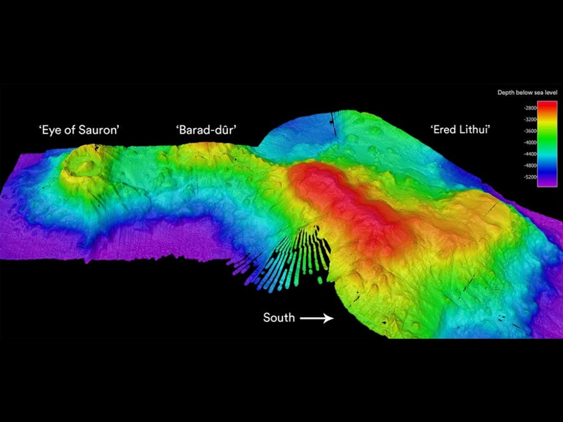 Το ηφαιστειακό “μάτι” δεν ήταν μόνο, καθώς περαιτέρω διερεύνηση της περιοχής αποκάλυψε στα νότια μία υποθαλάσσια οροσειρά η οποία είναι καλυμμένη από ηφαιστειακούς κώνους, ενώ ακόμα πιο νότια υπήρχε μία τεράστια επίπεδη επιφάνεια. Οι ερευνητές, ακολουθώντας πιστά την ονοματολογία από τον Άρχοντα των Δακτυλιδιών, τα ονόμασαν Barad-dur (Dark Fortress) και Ered Lithui (Ash Mountains).