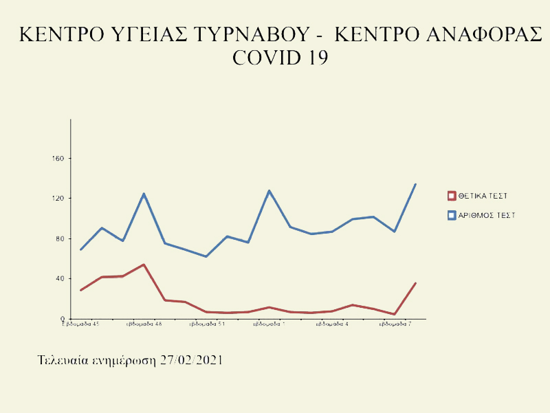 Τις τελευταίες μέρες παρατηρείται μια αύξηση των κρουσμάτων στην περιοχή του Δήμου Τυρνάβου η οποια αποτυπώνεται και στα τεστ που διενεργούνται καθημερινά (από το Νοέμβριο) στο Κέντρο Υγείας