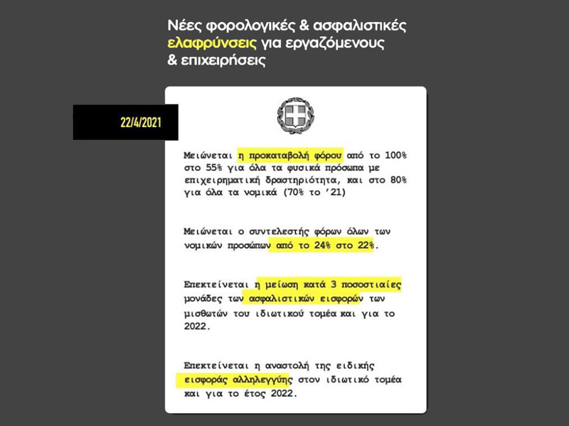 Σε ανακοινωση του ο Πρωθυπουργός Κυριάκος Μητσοτάκης αναφέρει ότι: ««Η κυβέρνηση έχει αποδείξει ότι σταθερή της προτεραιότητα είναι η μείωση της φορολογίας πριν, κατά τη διάρκεια της πανδημίας, αλλά και μετά από αυτήν. Και πρώτο μέλημά μας μετά την καταπολέμηση της υγειονομικής κρίσης είναι η ταχεία ανάκαμψη της οικονομίας και γι’ αυτό τον σκοπό ανακοινώνουμε σήμερα πέντε μέτρα τα οποία θα αποτελέσουν την βάση, το θεμέλιο, για την αποφασιστική επάνοδο. Και θα δώσουν τη δυνατότητα σε επιχειρήσεις οι οποίες σημείωσαν ζημίες μέσα στην πανδημία να μπορέσουν να γυρίσουν και πάλι σε θετικό πρόσημο.