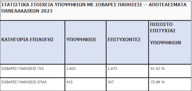 Σημειώνεται ότι όσοι από τους υποψηφίους της εν λόγω κατηγορίας έλαβαν μέρος και στις πανελλαδικές εξετάσεις ΓΕΛ και ΕΠΑΛ θα πληροφορηθούν ξεχωριστά για τα αποτελέσματα τους κάνοντας χρήση του αντίστοιχου κωδικού υποψηφίου(κωδικός πανελλαδικών εξετάσεων /κωδικός υποψηφίου σοβαρών παθήσεων)