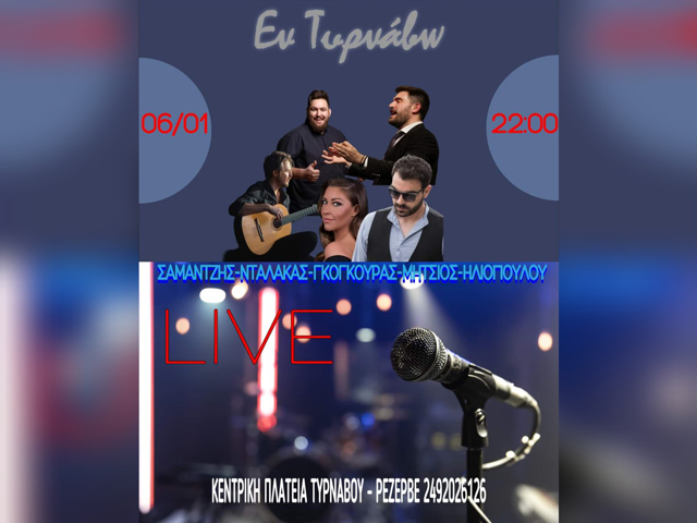 Άλλη μια μοναδική βραδιά έχει ετοιμάσει για σας το Εν Τυρνάβω καφέ – μπάρ στον Τύρναβο. Την Παρασκευή 6 Ιανουαρίου στις 22:00 πέντε καταπληκτικοί μουσικοί θα είναι εκεί να σας διασκεδάσουν.