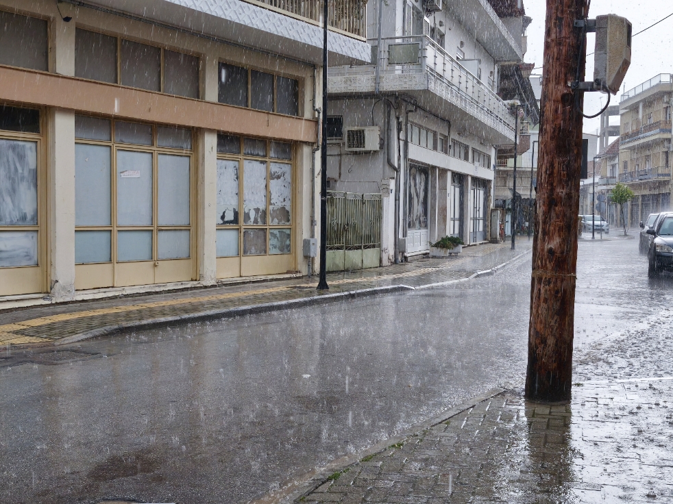 Ισχυρή βροχόπτωση έπληξε το απόγευμα της Τρίτης τον Τύρναβο, μετατρέποντας τους δρόμους σε μικρά ποτάμια μέσα σε λίγα λεπτά.