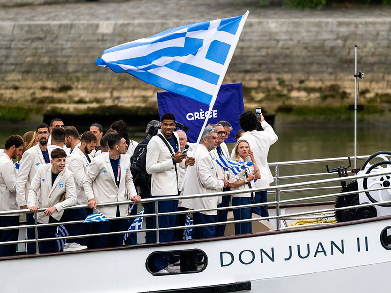Οι δύο σημαιοφόροι της ελληνικής αποστολής κρατούσαν την σημαία, με τα υπόλοιπα 98 μέλη να βρίσκονται επίσης στο πλοιάριο. Η στιγμή ήταν απόλυτα συγκινητική και προκάλεσε… ανατριχίλα βλέποντας αυτούς τους δύο κορυφαίους αθλητές να κρατούν τη σημαία.