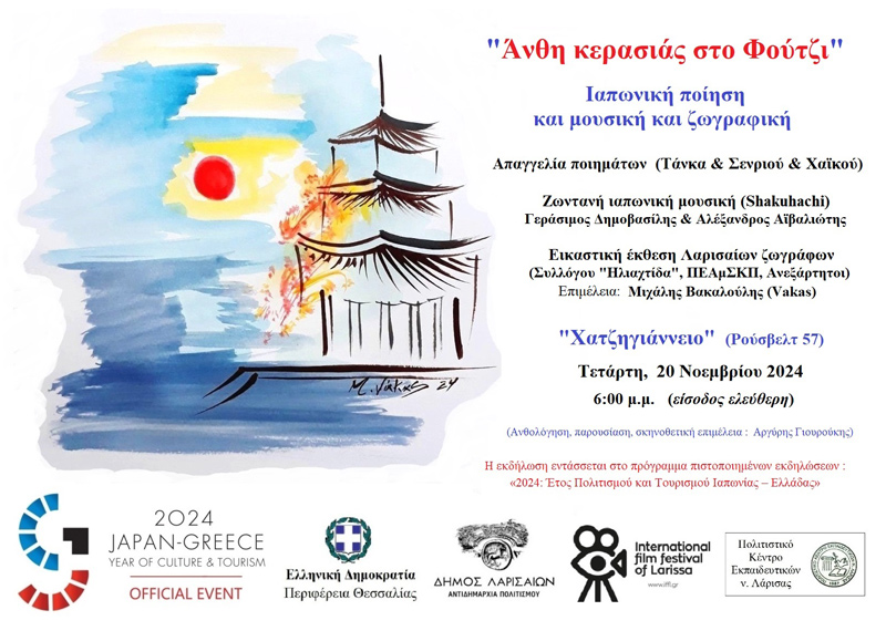 Το Διεθνές Φεστιβάλ Κινηματογράφου Λάρισας – Artfools, σε συνεργασία με το ΠΟΚΕΛ – Πολιτιστικό Κέντρο Εκπαιδευτικών νομού Λάρισας, σε συνδιοργάνωση με την Περιφέρεια Θεσσαλίας, υπό την αιγίδα του Υπουργείου Πολιτισμού και του ΕΟΤ, τη συνεργασία του Δήμου Λαρισαίων και με τη στήριξη του ΕΚΟΜΕΔ και του Γαλλικού Ινστιτούτου Λάρισας, διοργανώνει αφιέρωμα στον Ιαπωνικό κινηματογράφο και την Ιαπωνική κουλτούρα (ποίηση και μουσική και ζωγραφική). Η εκδήλωση «Άνθη κερασιάς στο Φούτζι» εντάσσεται στο πρόγραμμα πιστοποιημένων εκδηλώσεων / δράσεων για το «2024: Έτος Πολιτισμού και Τουρισμού Ιαπωνίας – Ελλάδας» και θα πραγματοποιηθεί στο Χατζηγιάννειο Πνευματικό Κέντρο (Ρούσβελτ 57), την Τετάρτη, 20 Νοεμβρίου 2024, στις 6:00 μ.μ., με ελεύθερη είσοδο.