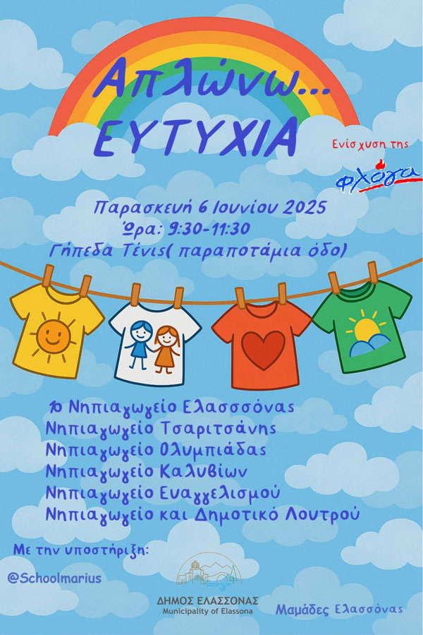 Η τελική δράση του προγράμματος θα πραγματοποιηθεί την Παρασκευή 6 Ιουνίου 2025, στα γήπεδα του τένις (κοντά στα ΚΤΕΛ Ελασσόνας), από τις 9:30 π.μ. έως τις 11:30 π.μ.. όπου και θα απλώσουμε τη «μπουγάδα της ευτυχίας».