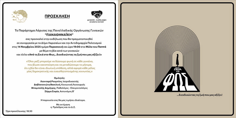 Το Παράρτημα Λάρισας της Πανελλαδικής Οργάνωσης Γυναικών «ΠΑΝΑΘΗΝΑΪΚΗ» πραγματοποιεί την πρώτη του εκδήλωση με τίτλο «Από τη σκιά στο φως… διεκδικώντας τη ζωή που μας αξίζει!», την Παρασκευή 14 Νοεμβρίου 2025, στις 19:00, στον Μύλο του Παππά, με θέμα τη βία κατά των γυναικών.