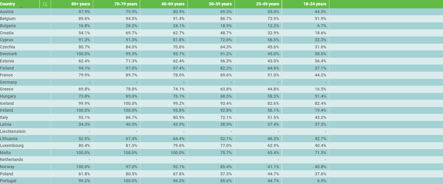 Όπως φαίνεται και στον παρακάτω πίνακα, το ποσοστό των 80 και άνω ετών που έχουν κάνει έστω την 1η δόση δεν έχει ξεπεράσει καν το 70%, συγκεκριμένα 69,8%, την ώρα που παραδείγματος χάριν στην Μάλτα έχει φτάσει στο 100%.