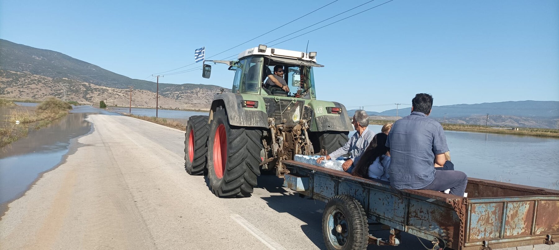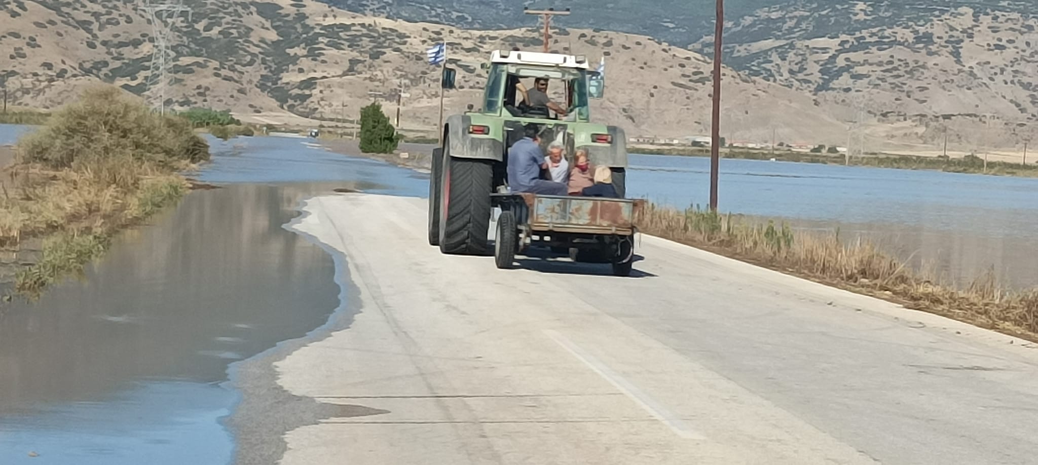 Στο τμήμα του δρόμου Αγιά – Λάρισα από Δήμητρα ως Ελευθέριο, που είναι και το μεγαλύτερο πρόβλημα με νερά πάνω στο οδόστρωμα, από χθες κινείται μόνο ένας μεγάλος γεωργικός ελκυστήρας με καρότσα, που μεταφέρει ανθρώπους προς τη Λάρισα για πολύ μεγάλη ανάγκη. Τρι­τοκοσμικές καταστάσεις, αλλά σωτήριες αυτή τη στιγμή, μιας και δεν υπάρχει άλλος τρόπος συγκοινωνίας. Από σήμερα δε, στην περίπτωση που πέσουν λίγο τα νερά στο “δρομολόγιο” αυτό θα μπει πυροσβεστικό όχημα. Ο Δήμος Αγιάς εξέδωσε την ακόλουθη ανακοίνωση: