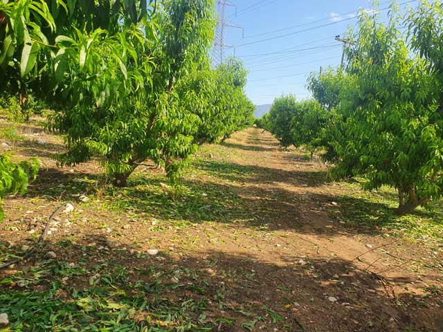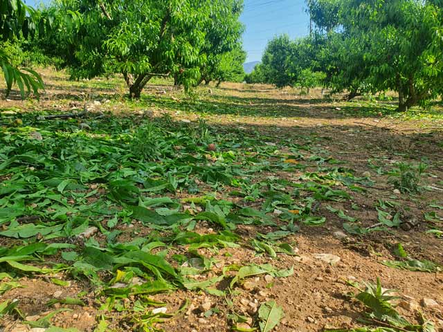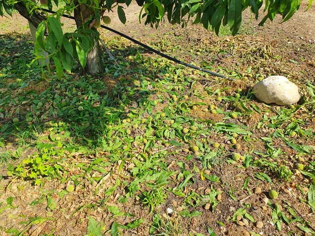 Επίσης στα συμπύρηνα ροδάκινα η ζημιά είναι μεγάλη, με μεγάλο ποσοστό του καρπού να έχει πέσει στο έδαφος.