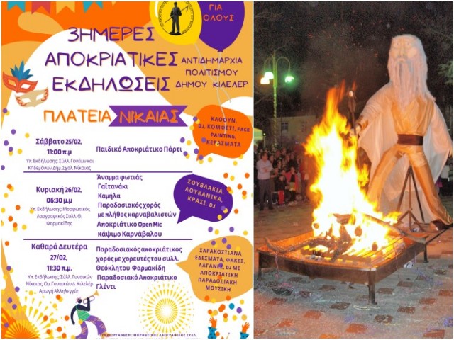 Σε αποκριάτικους ρυθμούς κινείται αυτές τις μέρες ο Δήμος Κιλελέρ. Τριήμερες αποκριάτικες εκδηλώσεις διοργανώνονται στην πλατεία της Νίκαιας υπό την αιγίδα της Αντιδημαρχίας Πολιτισμού του Δήμου Κιλελέρ με συνδιοργανωτές το Μορφωτικό Λαογραφικό Σύλλογο «Θεόκλητος Φαρμακίδης», τον Όμιλο Γυναικών Δήμου Κιλελέρ «Αρωγή Αλληλεγγύη», τον Σύλλογο Γονέων και Κηδεμόνων Δημοτικού Σχολείου Νίκαιας, το ΚΑΠΗ Νίκαιας, το Θεατρικό Εργαστήρι Δήμου Κιλελέρ, τη Δημοτική Βιβλιοθήκη Νίκαιας και την Τοπική Κοινότητα Νίκαιας.