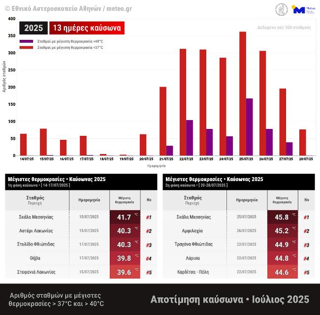 Το βράδυ της Δευτέρας 28 Ιουλίου 2025, έληξε ο καύσωνας 13 ημερών, ένας από τους μεγαλύτερους σε διάρκεια καύσωνες που έχουν καταγραφεί στη χώρα μας (οι 2 πιο μεγάλοι σε διάρκεια καταγράφηκαν τα τελευταία 3 χρόνια). Στο διάγραμμα που ακολουθεί, σύμφωνα με τις καταγραφές του δικτύου αυτόματων μετεωρολογικών σταθμών του Εθνικού Αστεροσκοπείου Αθηνών/ Meteo.gr, παρουσιάζεται ο αριθμός των σταθμών όπου η θερμοκρασία ξεπέρασε τους 37 °C και τους 40 °C (κόκκινες και μωβ μπάρες, αντίστοιχα).