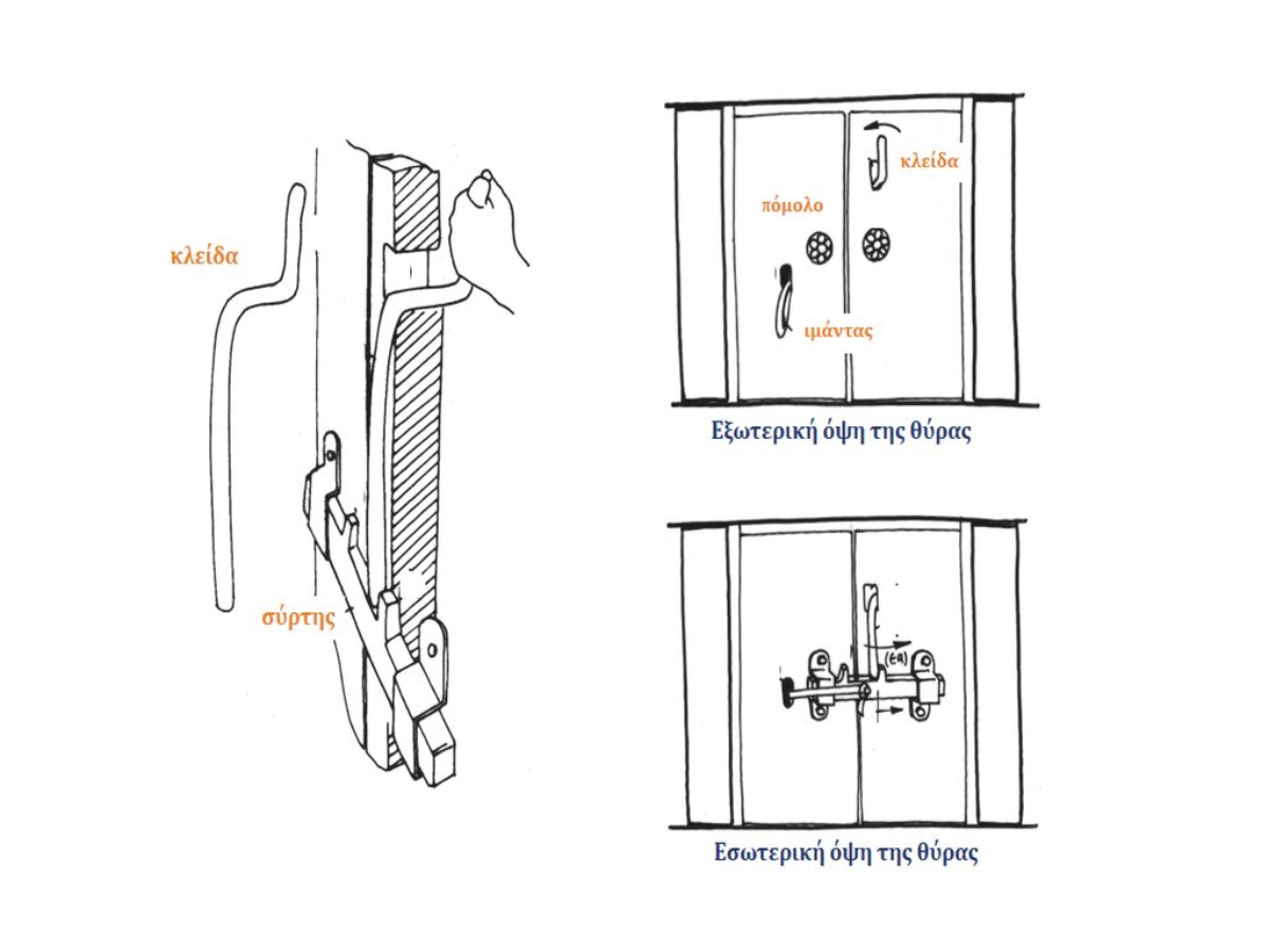 «Ο Αριστοφάνης περιγράφει την οργή των γυναικών, σαν βρίσκουν τα κουτιά και τις πόρτες κλειδωμένες από τους άντρες με μικρά οδοντωτά κλειδιά, τα οποία ονομάζονται λακωνικά κι έχουνε τρία δόντια» ανέφερε η κ. Βασιλειάδου και εξηγώντας τη λειτουργία τους σημείωσε ότι αυτά «προσαρμόζονταν σε μικρές εξωτερικές κλειδαριές, ήταν λεπτά, μακριά και είχαν στην άκρη τους δύο ή περισσότερα δόντια. Τα έβαζε κανείς από μια πλάγια εγκοπή μέσα στον ασφαλισμένο σύρτη, τα σήκωνε προς τα επάνω ωθώντας τη μικρή ασφάλεια απασφαλίζοντας έτσι το σύρτη, και τραβούσε το σύρτη προς τα πίσω ανοίγοντας την πόρτα. Σπρώχνοντας μετά το σύρτη με το χέρι αυτός ασφάλιζε από μόνος του. Το νέο στοιχείο στα κλειδώματα αυτά είναι λοιπόν η μικρή ασφάλεια σε σχήμα Π, που εμπόδιζε τη μετακίνηση του σύρτη και απασφάλιζε μόνο με ειδικό, «κρυφό» κλειδί».