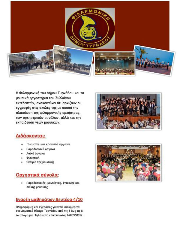 Η Φιλαρμονική του Δήμου Τυρνάβου και τα μουσικά εργαστήρια του Συλλόγου εκτελεστών, ανακοινώνει ότι αρχίζουν οι εγγραφές στις σχολές της με σκοπό την πλαισίωση της φιλαρμονικής ορχήστρας των ορχηστρικών συνόλων, αλλά και την εκπαίδευση νέων μουσικών.