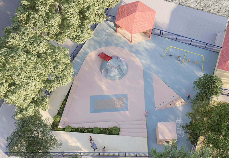 Αυτό επιτυγχάνεται από ένα διπλό σύστημα ελεγχόμενης πρόσβασης που επιτρέπει την ασφαλή λειτουργική ενοποίηση των δύο χώρων. Συγκεκριμένα δημιουργείται νέα πρόσβαση στο όριο της πλατείας και της παιδικής χαράς, καθώς και νέα περίφραξη με θύρα μεταξύ παιδικής χαράς και σχολικής αυλής. Με αυτές τις παρεμβάσεις η παιδική χαρά αποτελεί έναν ενδιάμεσο χώρο που δέχεται τους μαθητές με ασφάλεια κατά τη λειτουργία του σχολείου, ενώ επιτρέπει στους χρήστες την απογευματινή πρόσβαση χωρίς τη δυνατότητα εισόδου στη σχολική μονάδα…».