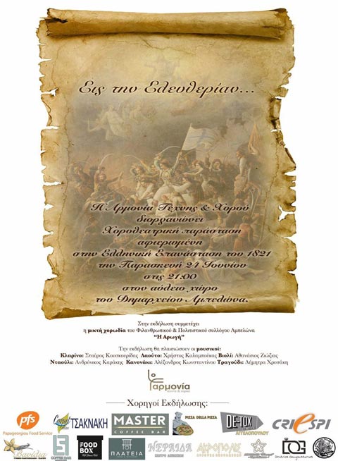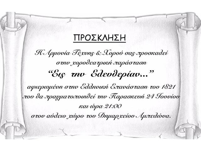 Η Αρμονία Τέχνης και Χορού διοργανώνει τη χοροθεατρική παράσταση ”Εις την Ελευθερίαν…” αφιερωμένη στην Ελληνική Επανάσταση του 1821 την Παρασκευή 24 Ιουνίου 2022 και ώρα 21:00 στον αύλειο χώρο του Δημαρχείου Αμπελώνα