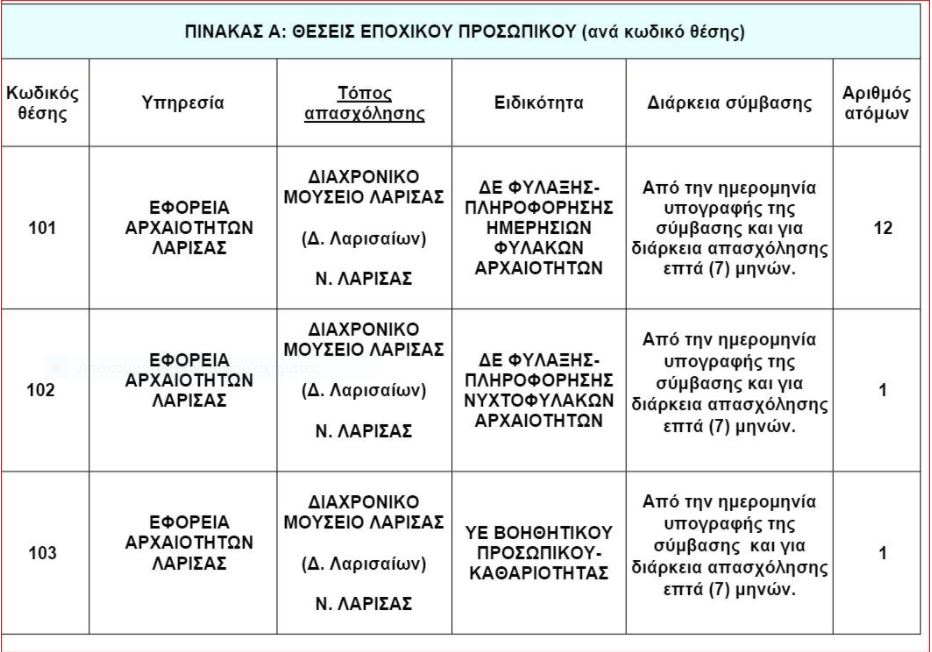 Pρόσληψη, με σύμβαση εργασίας ιδιωτικού δικαίου ορισμένου χρόνου, συνολικά 14 ατόμων για την κάλυψη εποχικών ή παροδικών αναγκών της Εφορείας Αρχαιοτήτων Λάρισας, που εδρεύει στη Λάρισα.