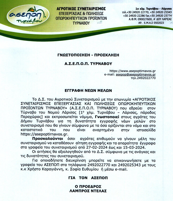 Το Δ.Σ του ΑΣΕΠΟΠ γνωστοποιεί στους αγρότες του Δήμου Τυρνάβου την πρόσκληση για εγγραφή νέων μελών στον συνεταιρισμό.